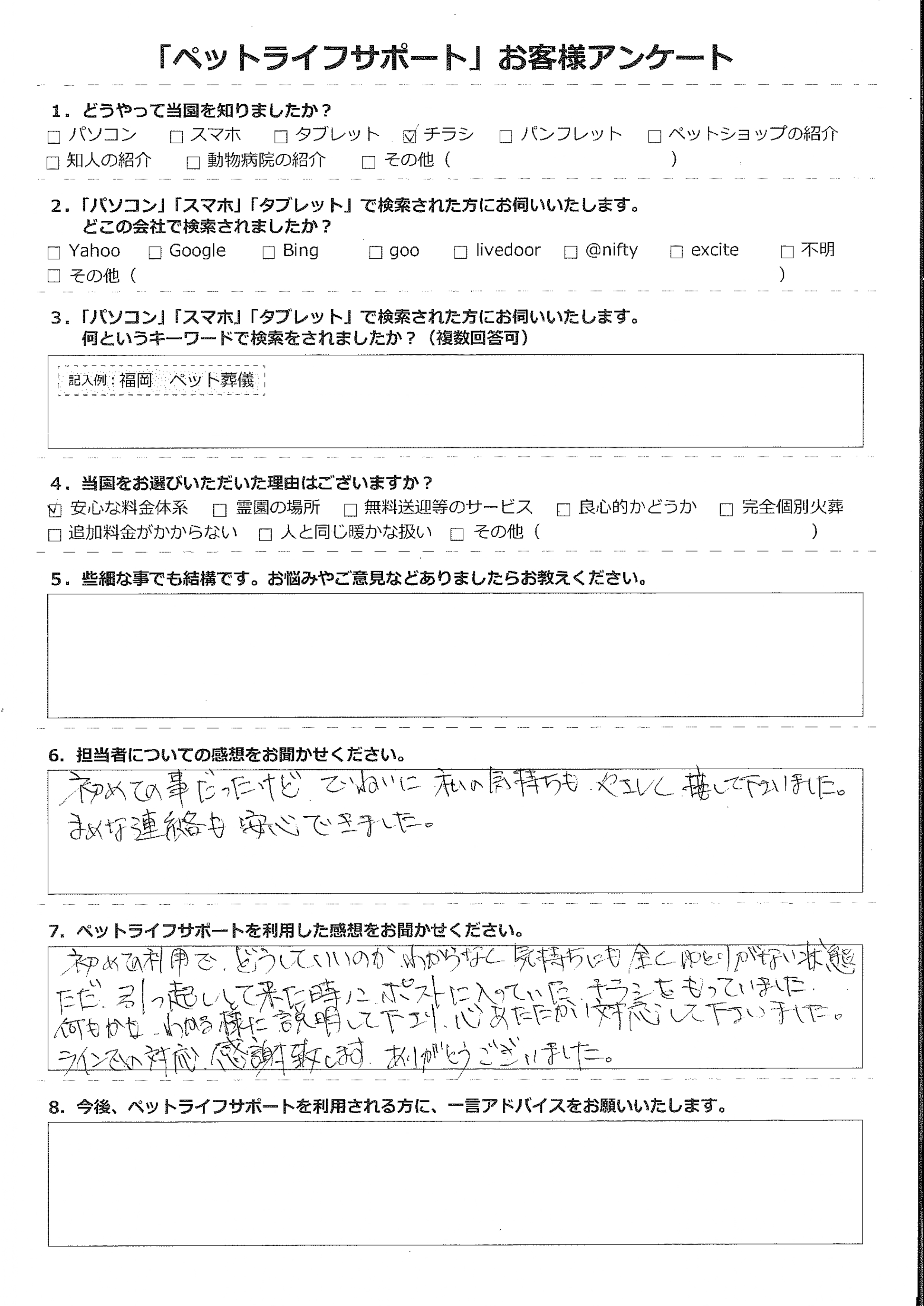 - 親切に丁寧にさいごのお別れができて本当によかったです。おありがとうございました!